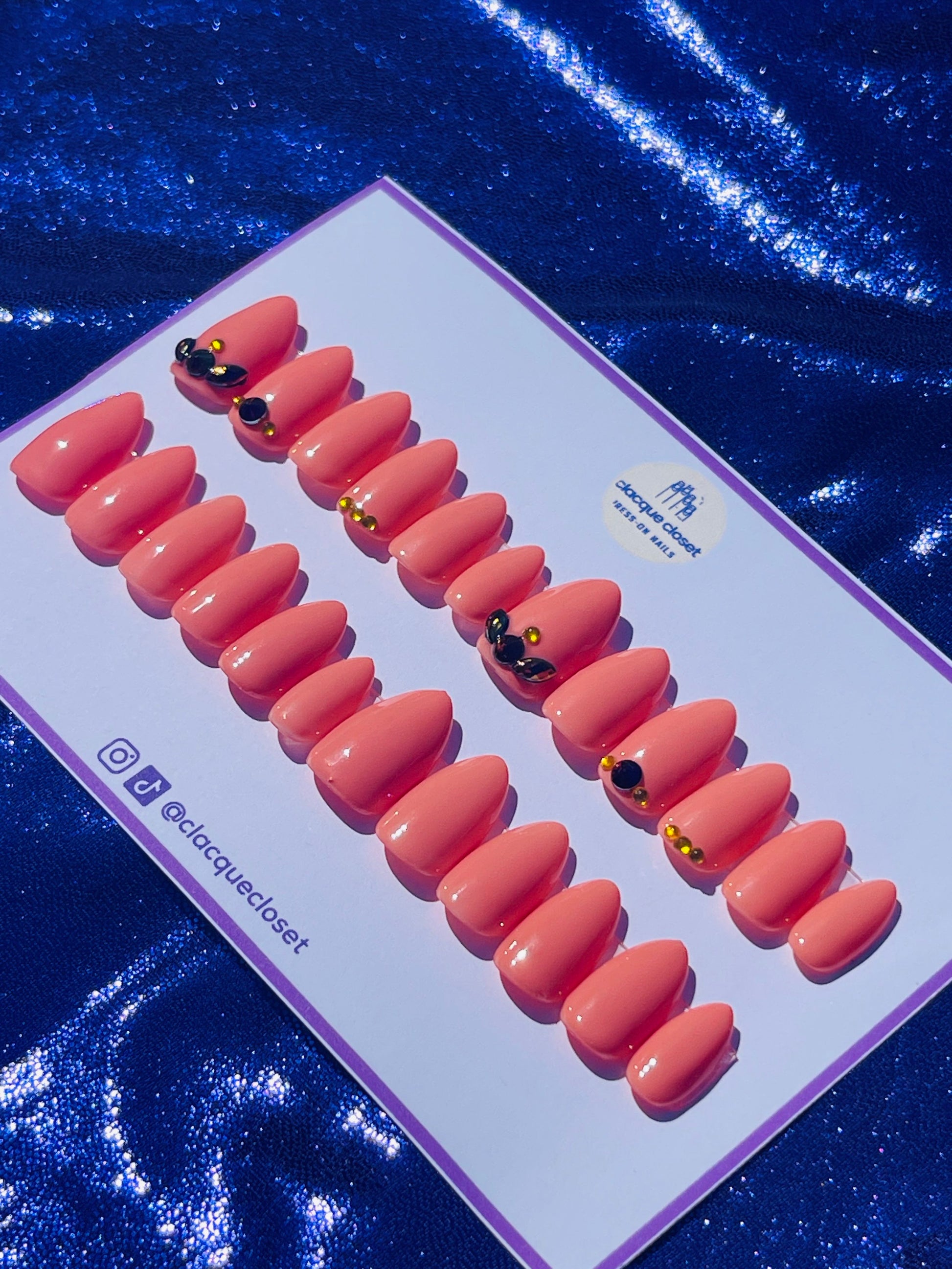 Designs include colors and simple embellishments. Want to take it up a notch with more textures / styles / bling? Order a custom set from the Luxury Lacquer collection.